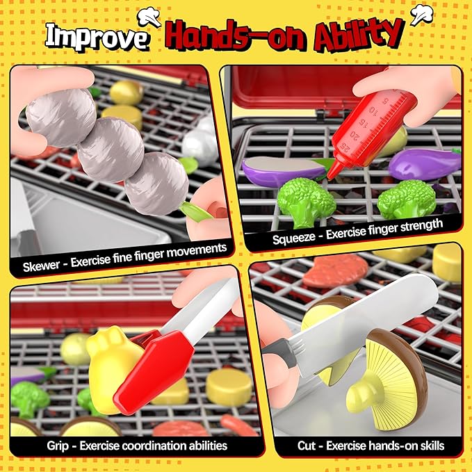 - 【Learn While Play】As your children cook up imaginary feasts with this interactive toy, they can learn cooking skills & motor skills & barbecue knowledge and promote creativity, social interaction and hand-eye coordination
