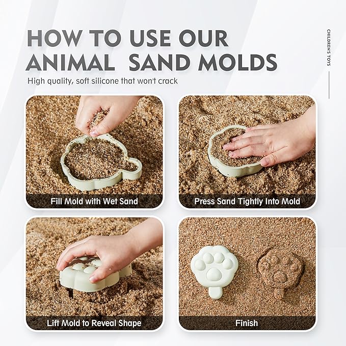 • Versatile:This set contains all the beach essentials for keeping your children engaged for hours.Let your children use the silicone molds to make fun shapes in the sand.Easy to clean,you can also use them in the bath