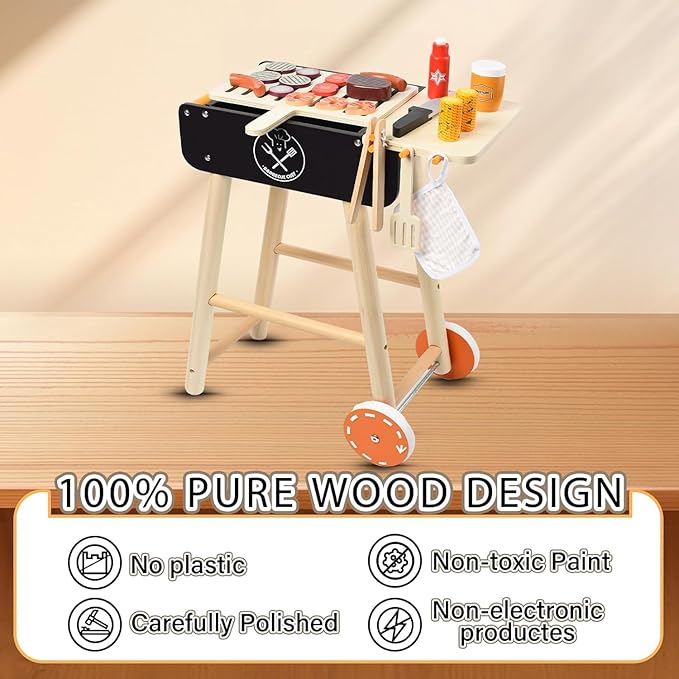• Safe and Durable Design: Made from high-quality wood, this toy grill is designed for safety and durability. It’s the perfect play food set for toddlers aged 3-6, ensuring hours of fun without compromising on quality