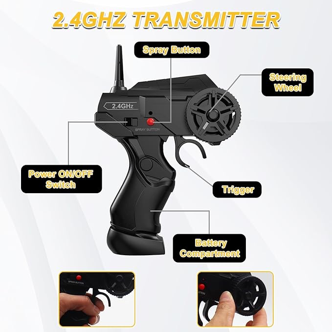 - [With LED Light Spray] This remote control drift car comes with a pair of cool LED lights and spray function. The lights will start flashing beautifully when the RC car is switched on. Turn on the spray button on the remote control handle, the back of the remote control car will show a cool and beautiful water mist, making the remote control car more cool and exciting to drive.