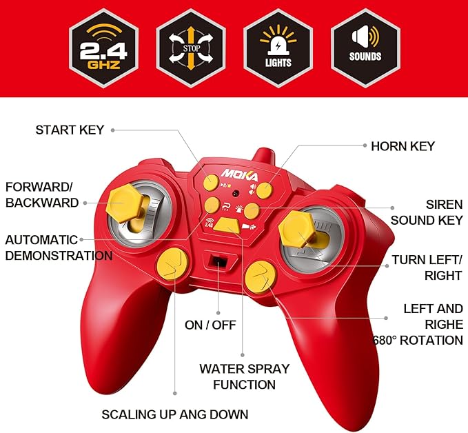 • 2.4Ghz Anti-interference: Automatic Pairing, suitable for multi players to drive together without Interference at the same place and time. The remote control firetruck for boys equipped with TWO 4.8V/500mAh high-quality rechargeable batteries. Provide kids with hours of fun and develop your toddler’s fine motor skills and hand-eye coordination.