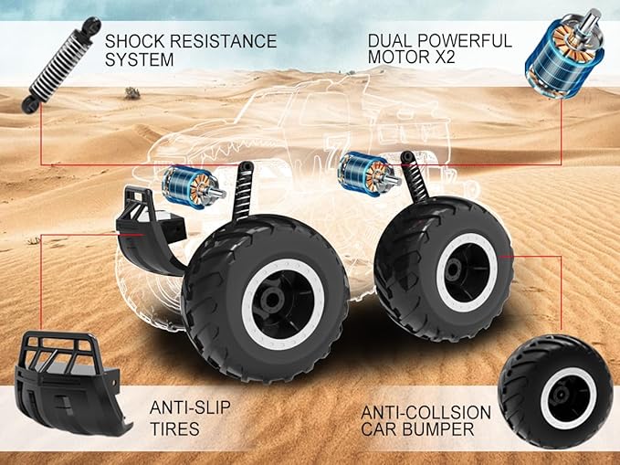 - 【ALL-TERRAIN AMPHIBIOUS RC CAR】: Built with a 4x4 off-road design, this remote control car to easily runs over a variety of complex terrains, like the land, sand and beach. It's not just an all-terrain rc monster truck, but also a cool toys boat for pools and lakes, ready to glide across rivers, ponds or any water surface. Makes an nice birthday gift for boy aged 6+. ///The Remote is not waterproof!!!