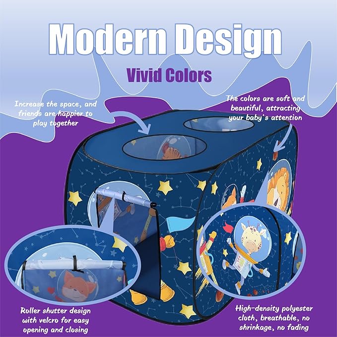 - 【Endless Fun】 Let your child imagine that he or she is an astronaut in the world of the universe. Open the cosmic tent. Now you can start your space adventure and explore outer space. With spaceship shapes filled with shiny stars and objects, they'll even be happy to share the space tent and fort with siblings and friends while playing the roles of astronauts, captains, aliens and more.