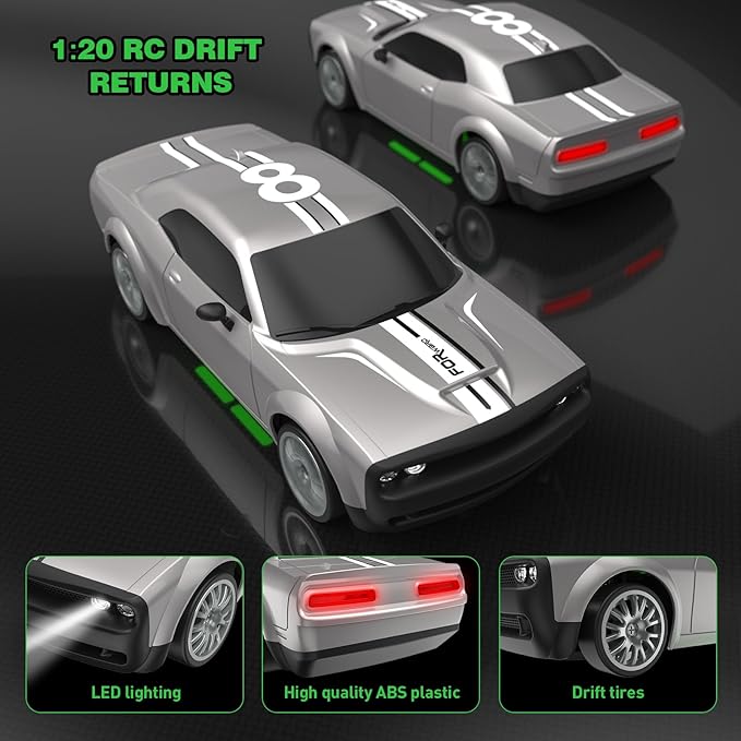 Remote Control Car RC Drift Car 2.4GHz 1:20 Scale 4WD 20KM/H High Speed Remote Control Cars Vehicle with LED Lights Drifting Tire 2Pcs Rechargeable Batteries Toy Cars for Adults Boys Girls (Silver)