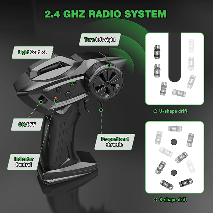 - 2 Tire Configurations: Drift car comes with 4 speed racing tires and 4 drift tires. When you want to show off this rc drift car with stunts, you can use drift tires,with better handling and perfect agility, and when you want to make it a sports car, the racing tires will be your best choice