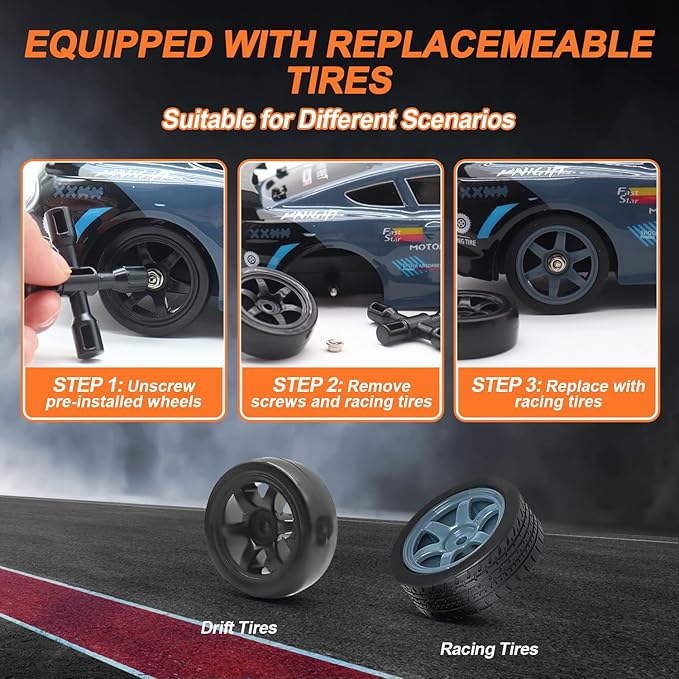 - 【Double Tire Configuration】 The drift car is equipped with 4 speed racing tires and 4 drift tires. Rallying tires suitable for outdoors, another ones are for drifting indoors. Two kinds of tires can make the RC car adapt to more different road surfaces, can drift on smooth boards, tiles, tracks, better handling, better agility