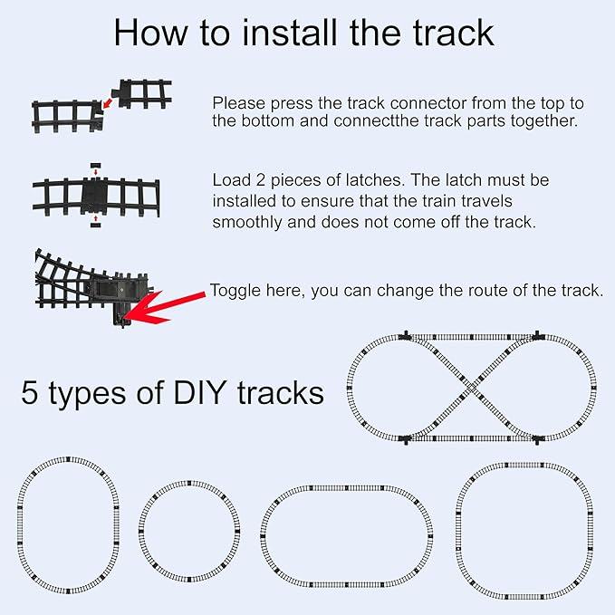 - 【Luxury Train Railway Track 】There are various tracks in the package for kids to DIY, they are Left-Y Tracks, Right-Y Tracks, X Track, Curved Tracks and Straight Tracks. The max size is 97’’ (L) x 41’’ (W) . DIY your favorite style.