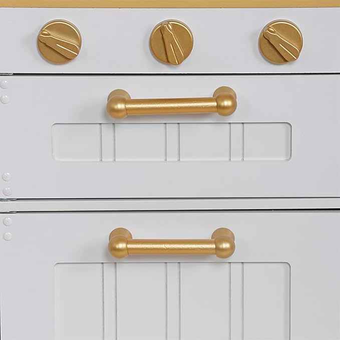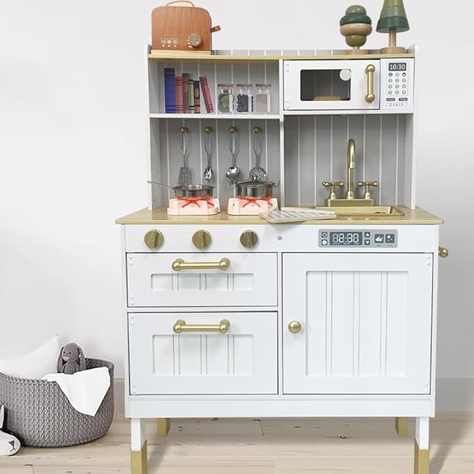 - Simulated Design - Wooden Play Kitchen with Lights and Sounds. The baby kitchen stoves feature real cooking set for kids,sounds that simulates a real one with three methods, make pretend play kitchen more lively and interesting, create an immersive play experience for children and kids.