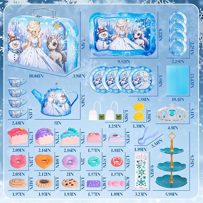 • โ„๏ธ Super Value Kids Tea Party: With a tin teapot, tin serving tray, tin tea cups, saucers, plates, BPA-free plastic desserts, and frozen accessories (frozen heart crown, tablecloth, star stickers etc), your princess will enjoy the happy teatime with friends and family! Plus, the included cardboard carrying case makes it easy to bring the fun on-the-go!