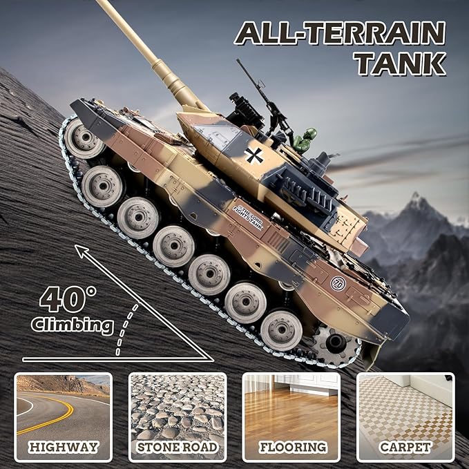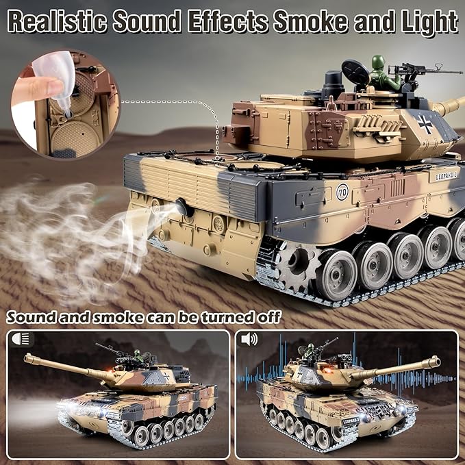 - 【Leopard II Battle Tank Toys】: German rc army tank has many functions, such as forward and backward, right and left rotation, central 360 degrees rotation, turret 330 degrees rotation, 30 degrees barrel up and down, recoil, smoke, sound and lights, firing airsoft bbs and water bullets, 40 degree s climbing slope. (sound and smoke can be turned off).