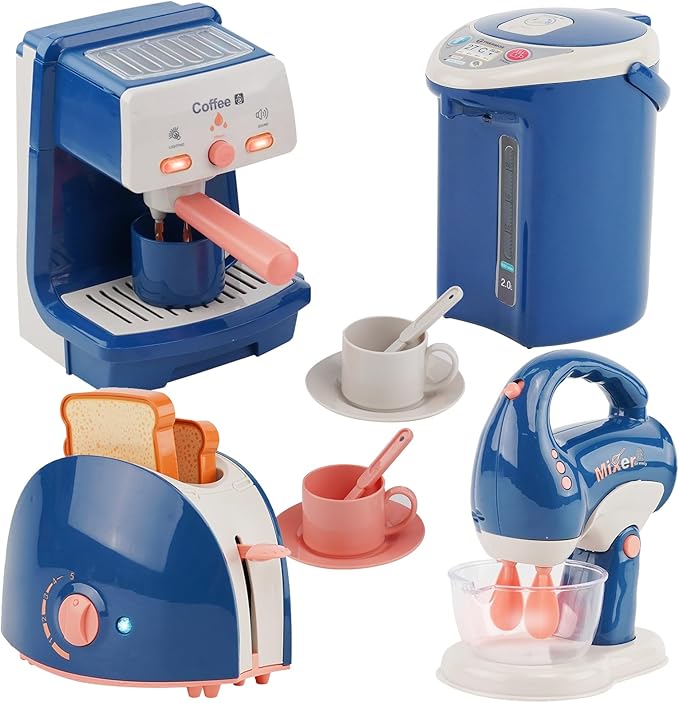 - 【Multiple accessories】This kitchen toy set includes toaster, coffee making machine, water dispenser, and blender with realistic sound, spoons, coffee cups, dishes, play food for your little ones to enjoy countless hours of fun.(⭐⭐⭐Tips: If pumping does not work, there may be air in the pipe. You need to open the cover and shake it hard a few times.)
