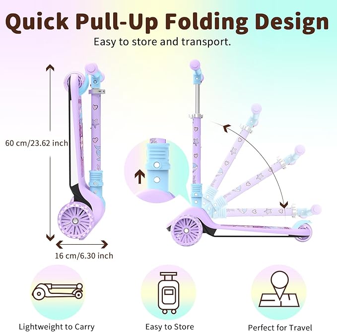 - Foldable & Lightweight: Featuring an easy folding mechanism, this light-up scooter effortlessly collapses into a compact size. Weighing only 7 lbs, it is easy to handle. The foldable design simplifies storage and transportation, meeting all your needs whether you’re carrying or storing it. Bring this cool scooter along and let the children ride confidently and happily in skate parks or on the street.