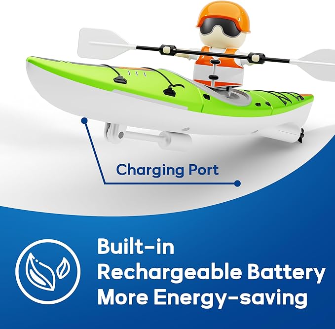 - 【More Ways to Play】This kid's boat toy can be controlled directly with a remote control with forward, backward, and turning movements. It can also be switched to paddle mode, then the kayaker can actually propel it forward with entertaining rowing action. In this mode, you can also acceleration the boat with the remote controller.
