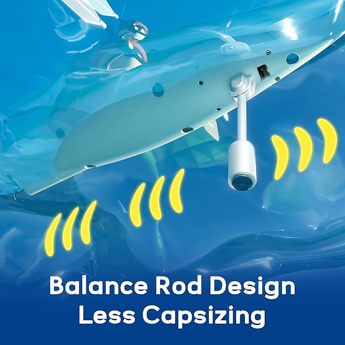 - 【How to Play】To prevent capsizing, lower the balance rod on the bottom of the kayak before putting it in the water. Thanks to the water sensing technology, the kayak's motor only starts when it encounters water and will activate flickering lights, allowing for fun even at night.