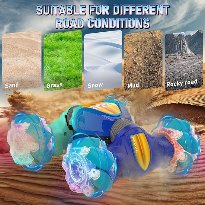 - 【2 Batteries, Hours of Fun】2 rechargeable batteries (3.7V 500mAh)*2 provide long-lasting fun. Let kids stay away from screens to play with stunt car toys with colorful lights and autopilot mode. The remote uses two "1.5V" AAA batteries (included). The gesture remote uses a built-in rechargeable battery (charger included).