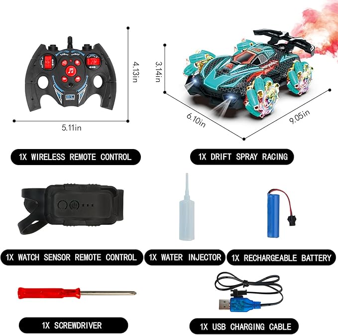 • Multifunctional Remote Control Stunt Car: Features 360-degree spins, 45-degree diagonal sprints, and agile side-slides. A new level of car stunts. Dazzling lights, cool water mist, and real engine sounds deliver an immersive experience