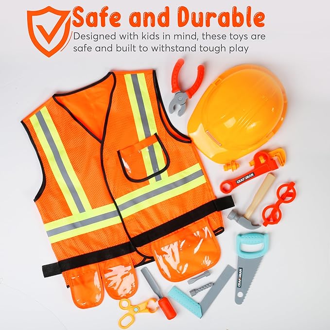 - Realistic Look- Give your little one the ultimate construction experience with our kids pretend play toy set, which is designed to give a lifelike appearance with its bright orange safety vest, sturdy helmet, and other realistic accessories that mimic the tools and gear used by professionals