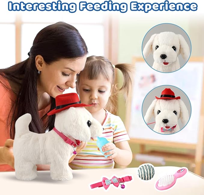 - DIY Pet Toy Dog for Kid:Walking puppy toy set let child experience a different kind of fun and games. Grooming, DIY styling, feeding and playing with dog. Dog toys in a wonderful box with a dog and all accessories, pet toy ball, comb, bottle, hat, a bow tie collar.