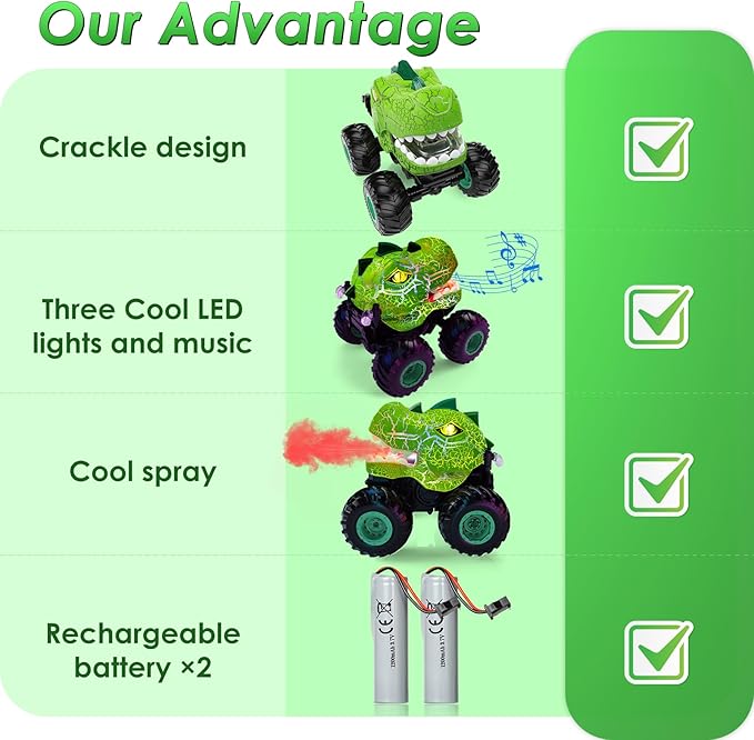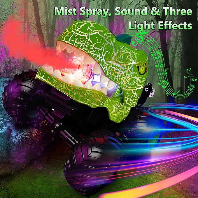 - 【Music, Lights & Cool Spray】:Featuring a distinctive mist spray function, this dinosaur car mimics a roaring, breath-blowing dinosaur. The dinosaur body showcases a unique crackle design with 3 different lighting modes: fast flashing, slow pulsing, and continuous lighting. The RC car can also play music through built-in speakers, easily controlled via the remote.(The remote control needs 2 AA batteries but not included in the package.)