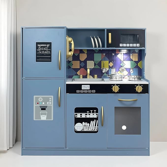 - ๐ Simulated Design - Play Kitchen with Lights. Oven, cabinet, freezer, refrigerator and microwave doors open and close. Equipped with a variety of realistic cooking utensils,make pretend play more lively and interesting. Create an immersive play experience for children and kids