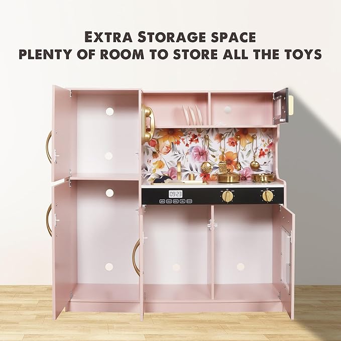 - ๐ Simulated Design - Play Kitchen with Lights. Oven, cabinet, freezer, refrigerator and microwave doors open and close. Equipped with a variety of realistic cooking utensils,make pretend play more lively and interesting. Create an immersive play experience for children and kids