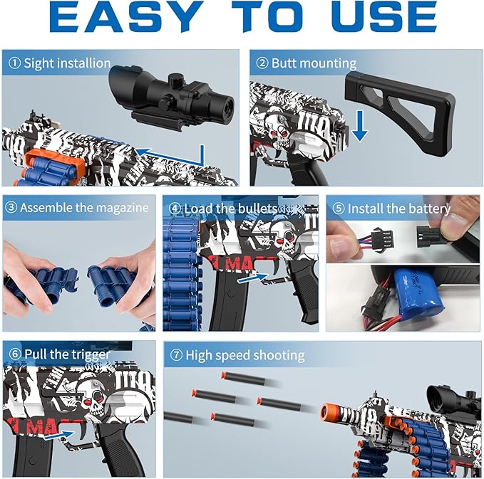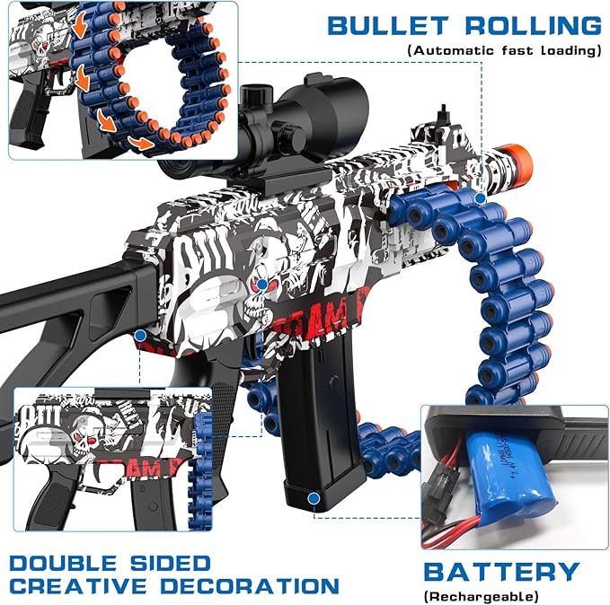 • The True King of Toy: This big electric toy boasts a "Gatling" style with 30 darts capacity. The automatic belt rotation loads the next dart after each shot, giving you an unparalleled advantage, making you the ultimate king of the battlefield.