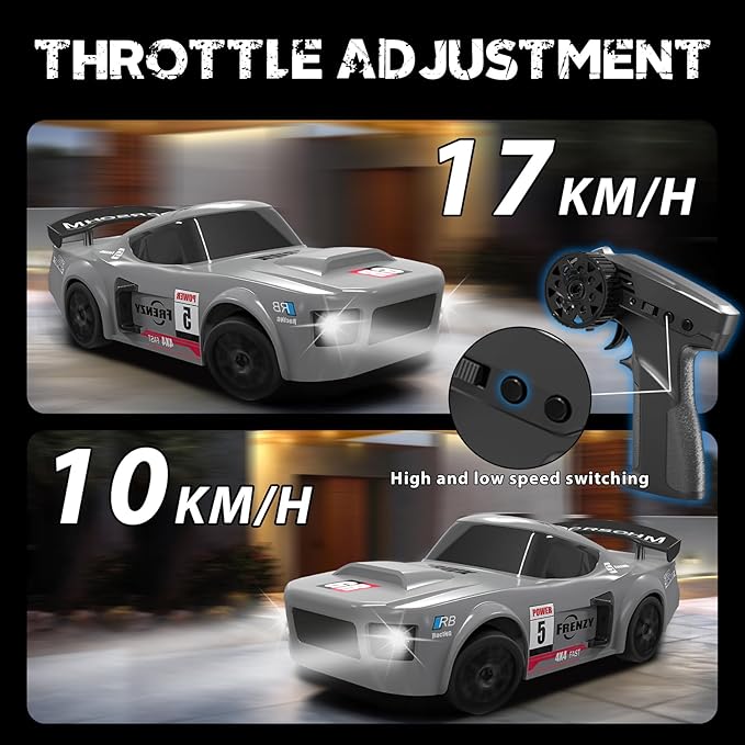 - Adjustable Speed And Light Control: Our drift car offers variable speed settings, allowing you to switch between 17 KM/H high-speed mode (for exciting races) and 10 KM/H low-speed mode (for complex maneuvers). Coupled with remote control light system, you can turn the lights on or off as needed, and night driving ensures your road is brightly lit, allowing you to enjoy a more exciting racing adventure
