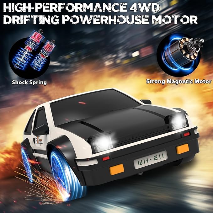 • Adjustable Speed And Light Control: Our drift car offers variable speed settings, allowing you to switch between 17 KM/H high-speed mode (for exciting races) and 10 KM/H low-speed mode (for complex maneuvers). Coupled with remote control light system, you can turn the lights on or off as needed, and night driving ensures your road is brightly lit, allowing you to enjoy a more exciting racing adventure