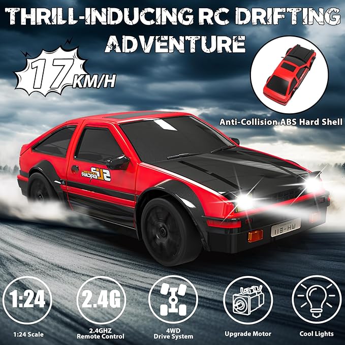 • Heart-Racing RC Drift: Experience adrenaline-pumping drifts with our 1/24 scale RC car. Navigate tight turns and perform 360° spins with ease, reaching thrilling speeds of 17 km/h. Constructed from premium ABS material, this RC cars is built to last, while its LED signal lights add a touch of excitement to night-time driving sessions, enhancing your kids gaming experience with an extra dimension of fun