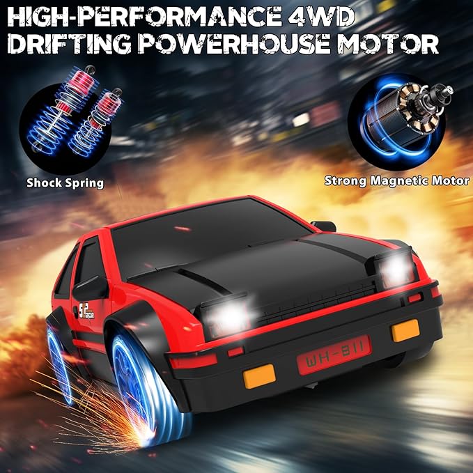 • Adjustable Speed And Light Control: Our drift car offers variable speed settings, allowing you to switch between 17 KM/H high-speed mode (for exciting races) and 10 KM/H low-speed mode (for complex maneuvers). Coupled with remote control light system, you can turn the lights on or off as needed, and night driving ensures your road is brightly lit, allowing you to enjoy a more exciting racing adventure