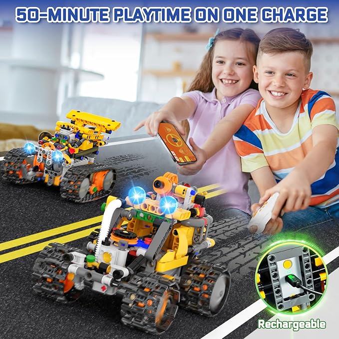 - Rechargeable and 50min Long-Lasting Joy --- Equipped with a high-capacity rechargeable Li-Po battery safely embedded within the motor building block, the kids robot delivers powerful performance, providing 50 minutes of joyful playtime on a full charge for kids, teens, and adults. (Comes with a Type-C to USB charging cable included)