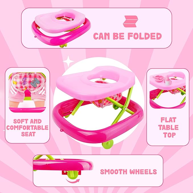 - Good Material - The baby doll has a cute face, its hands and feet are made of vinyl, the doll's clothes and hat are striped and pink, and the doll's clothes are soft and feel good; the baby walker is beautifully made and sturdy, with rolling wheels and soft cushions, and can be folded and placed, which is very suitable for children over 1+ year old to play.