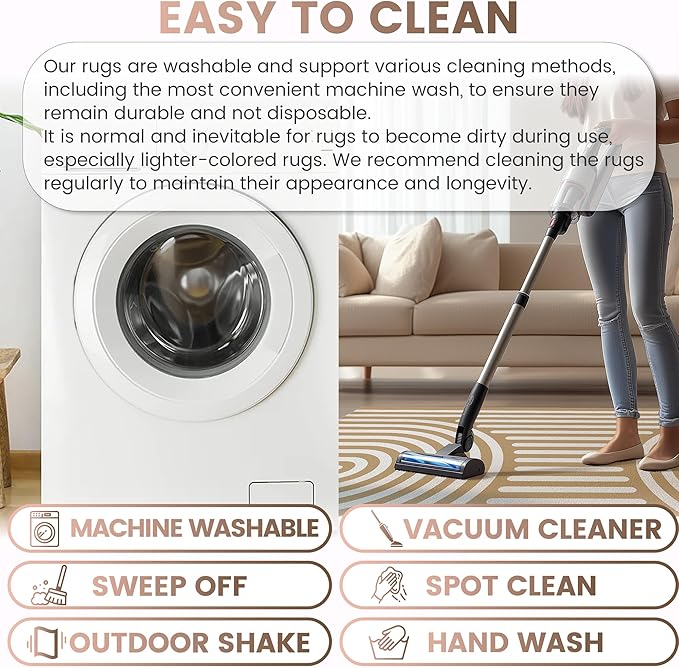 - 【MACHINE WASHABLE & FOLDABLE】The washable area rug is made of high-quality spill and stain-resistant microfiber. Low pile rug is not prone to dirt buildup, you simply need to broom or vacuum the surface to clean, or just move the entire rug into the washing machine. Foldable rugs can be moved and stored more easily without taking up much spaces. The creases and resistance to laying perfectly flat are only temporary.