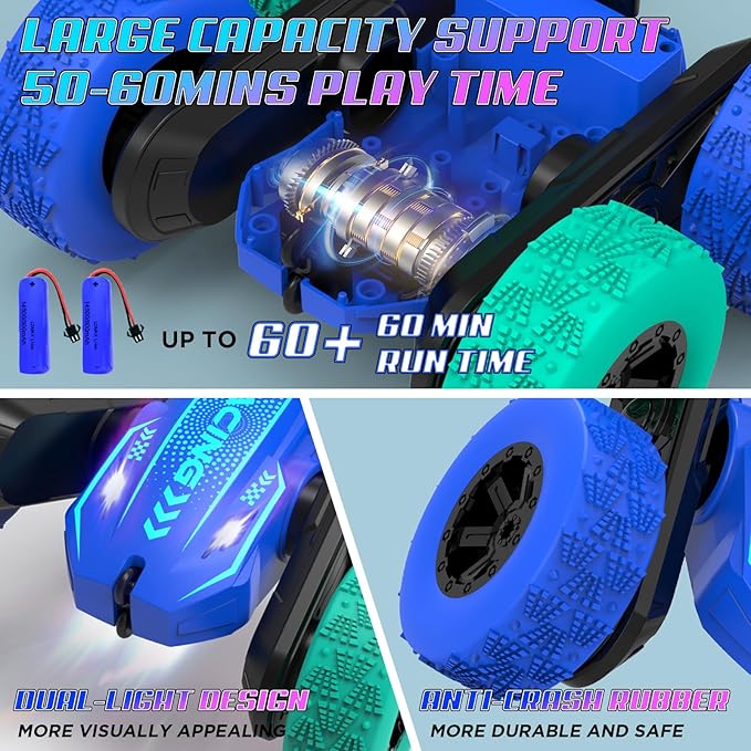 • Long-lasting Playtime: 2 rechargeable batteries for 60mins playtime, experience uninterrupted excitement with our RC car's dual 3.7V 500mAh batteries for extended long playtime and dual 1.5V AA batteries for the remote control, perfect toys for ages 5-7 8-13 boys girls kids