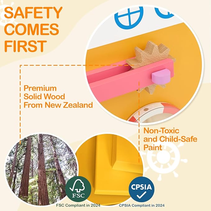 • SAFETY COMES FIRST: Crafted with the highest quality solid wood from New Zealand, our busy board has passed rigorous safety tests and received the Children's Product Certificate from a CPSC accredited laboratory, ensuring a safe play environment for little ones.