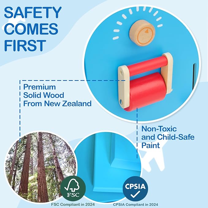 • SAFETY COMES FIRST: Crafted with the highest quality solid wood from New Zealand, our busy board has passed rigorous safety tests and received the Children's Product Certificate from a CPSC accredited laboratory, ensuring a safe play environment for little ones.