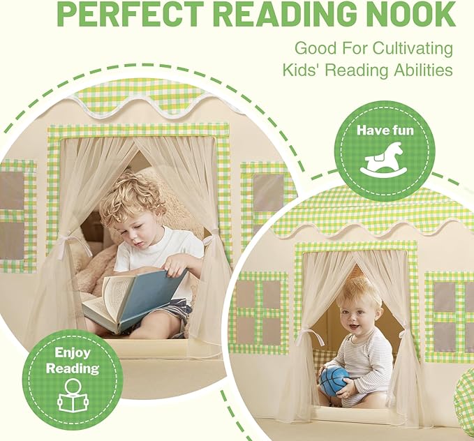 Kids Play Tent Indoor: Mat, Tassel Garland, Star Lights - Green Checkered Boys Tent Playhouse for Toddlers Kids Toys for Boy Girl Birthday Gift