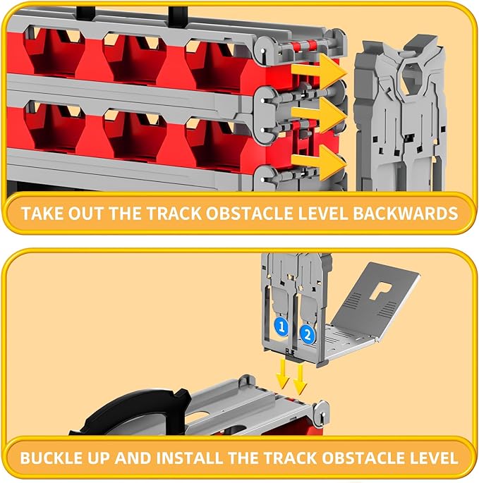 • Launching Powered Racing Mode: Kids pull the storage layer of toddler boy toy to become a long car railway, repair the obstacle tailboard at the end of the railway, and place 2 small car at the front. Push the button to enjoy the fun of fast racing car mode
