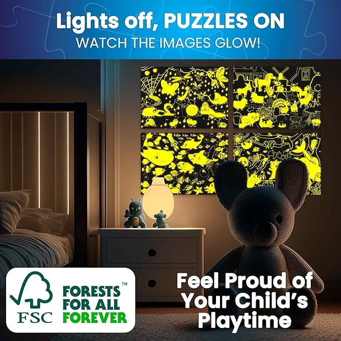 • GLOW-IN-THE-DARK EFFECT: each puzzle has a magical glowing layer, enhancing the experience of the images in the evening and night; these children puzzles absorb light and reveal the magic at dusk; Beloved puzzles for kids ages 3-5, 6-8, and even 8-10