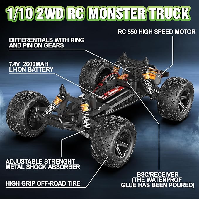 - Full-Scale High-Speed Monster Truck: This monster truck features adjustable strength coilover shock absorbers, a high-torque waterproof servo, and reinforced bumpers. The LED lighting system and metal components, including gears, transmission shafts, axles, and chassis armor, ensure durability and performance on all terrains, from sand and grass to wilderness and roads.