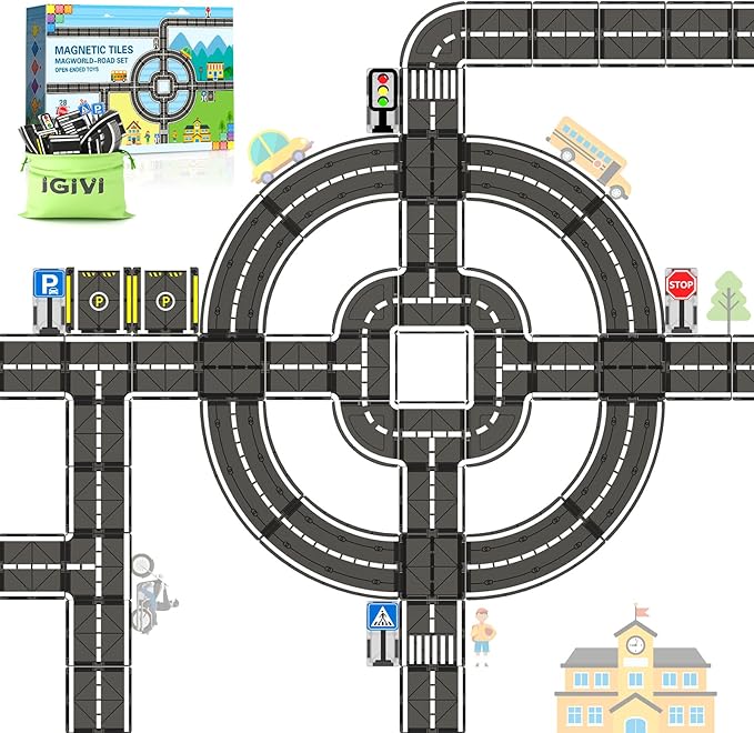 - 45-DEGREE MAGNETIC TILES ROAD CURVE - The IGIVI magnetic road set consists of 22 magnetic road tiles, 4 traffic signs, and 2 parking spaces. In this magnetic road tile set, we have added a new 45-degree curve magnetic tiles, allowing children's city roads to have more possibilities. Kids can unleash their imagination, create city road models, simulate road traffic command, and let toddlers play the role of "urban road builder" or "road commander". This provides more creativity and interactivity for children, allowing them to experience greater fun and imagination in their play.