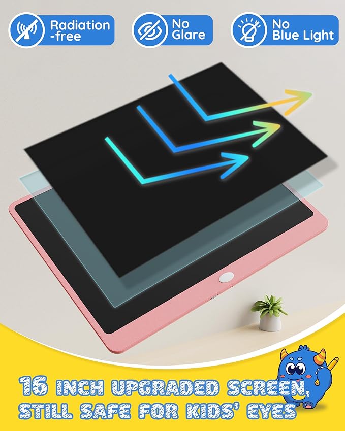 - Upgraded 16-inch Large Screen:The large 16-inch color screen writing space is large enough to be like A4 paper. Let your kids let their imagination run wild, draw, write, spell, count, play games, and have all kinds of creative fun. The pen string can be attached to the doodle board so it won't get lost