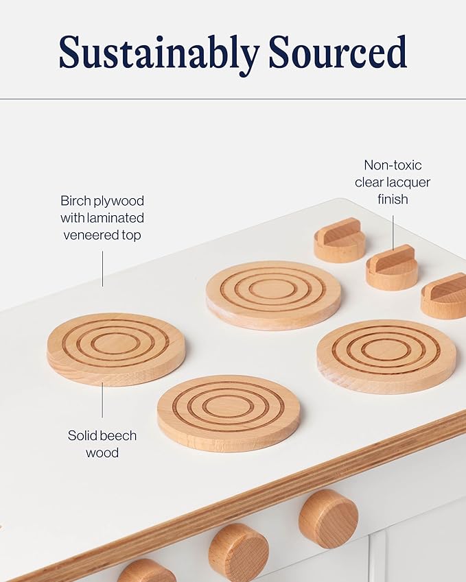 • SAFE & DURABLE: Crafted from sustainably sourced birch plywood, this wooden kitchen set features non-toxic finishes for safe play. Fully meets safety standards, offering complete peace of mind while your child explores culinary creativity.