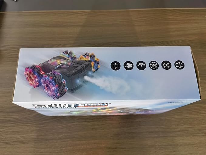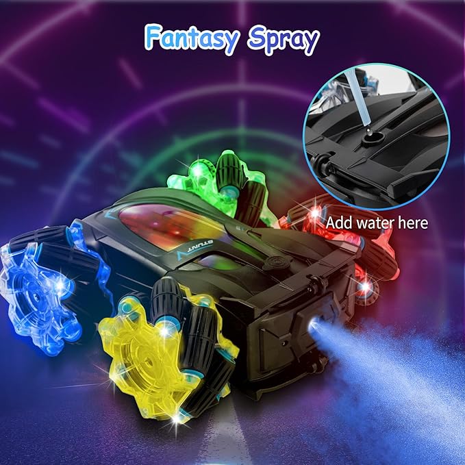 - 【RC Stunt Car】The remote control car can move in all directions, rotate 360°, flip on both sides, drift and dump, with cool lights, music and spray effects, it brings wonderful operation experience and visual effects for children.