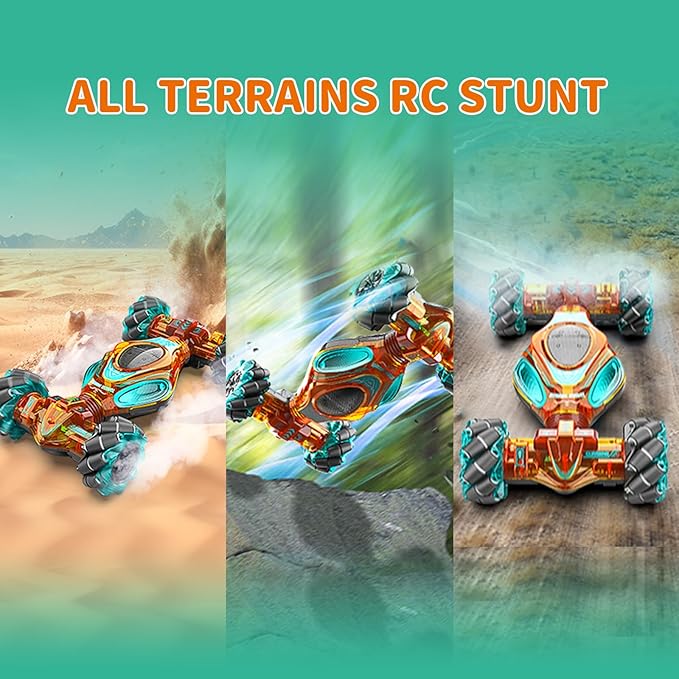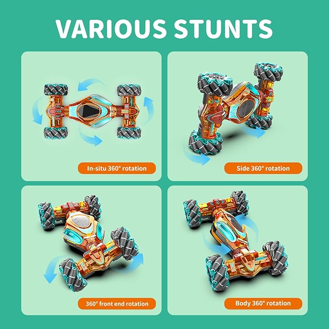 - All-Round Drift & Cool Stunt:4WD High-Tech gesture sensing rc stunt car can drive and drift in all directions, 360° rotation, 45° climbing, double-sided body flip, Double-sided Driving can easily pass obstacles,Cool functions and unlimited fun give children wonderful operation experience and visual effects.