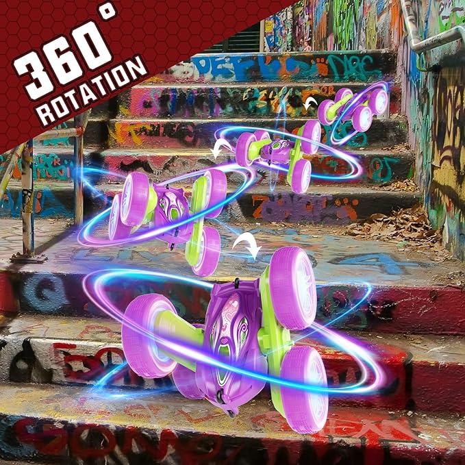 - New Upgraded Stunt RC Car with Lights: Not only go forward, backward, turn left, turn right, but also 360-degree roll and flip to drift in all directions, giving your children a different gaming experience. This durable remote control car toy is specially designed to be driven on both sides to easily cross obstacles. At the same time, this function can also turn the toy car into a dancing car instantly by suddenly moving forward and backward. Children will go crazy for it.