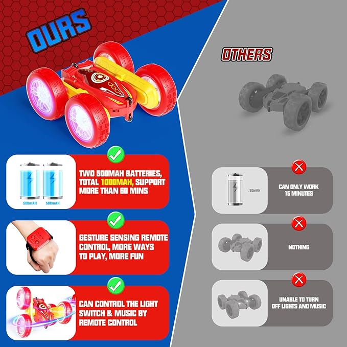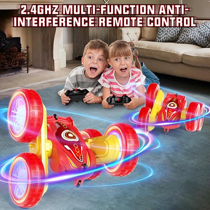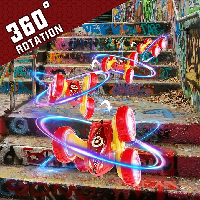 - New Upgraded Stunt RC Car with Lights: Not only go forward, backward, turn left, turn right, but also 360-degree roll and flip to drift in all directions, giving your children a different gaming experience. This durable remote control car toy is specially designed to be driven on both sides to easily cross obstacles. At the same time, this function can also turn the toy car into a dancing car instantly by suddenly moving forward and backward. Children will go crazy for it.