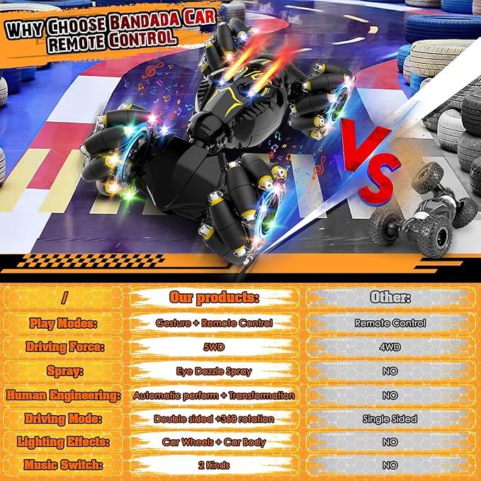 - ๐ใChristmas Gifts for Kidsใ: Our 2.4GHz gesture-sensing rc car, featuring eye spray, transformation, lights, music, drifting, remote control,watch induction,and performance functions. RC car is specially designed for Birthday, Children's Day and Christmas for toys for ages 6-12, which is an ideal choice for gift. Let this remote control car warm your kids stomach and heart