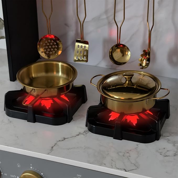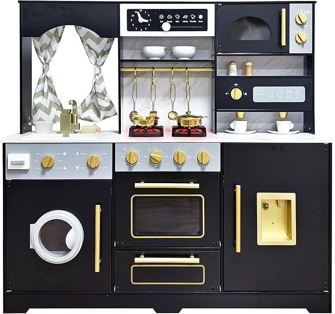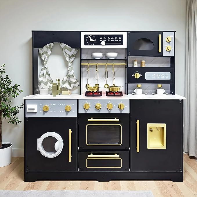 - Full kitchen set❗The large play kitchens playset has been equipped with everything a little chef might need, oven, water dispenser, ice maker, washing machine, coffee maker, microwave, stove, faucet, and sink. Rich configuration can enhance children's coordination and imagination.