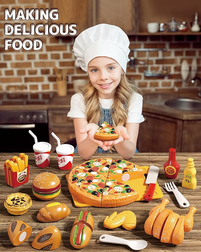 • 【Diverse Play Food Collection】With 80+ pieces—from pizza slices and burgers to fruits, veggies, and desserts—this kitchen set offers endless pretend-play possibilities. Durable plastic tools with rounded edges are included for safe handling, ensuring a complete and engaging kitchen experience.